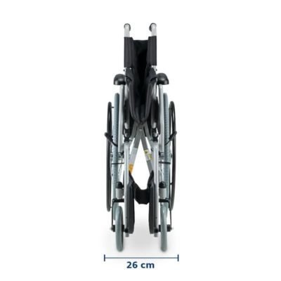 Com chassi de aço carbono, ela é dobrável com sistema duplo X, o que facilita o transporte e armazenamento, cabendo até em porta-malas de carros compactos. Possui estofamento em nylon acolchoado, apoio para braços e pés rebatíveis e ajustáveis, além de freios bilaterais ergonômicos. As rodas com pneus maciços são antifuro e o aro de propulsão é de aço carbono.
